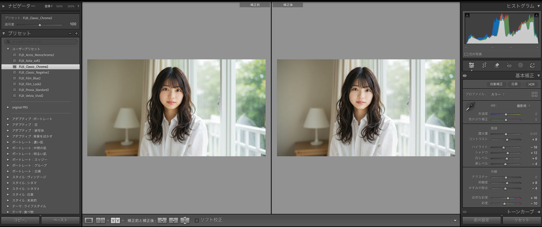 - 「FUJIFILM風」専用のLightroomプリセットが8種類含まれています。多彩なスタイルで写真を彩ります。