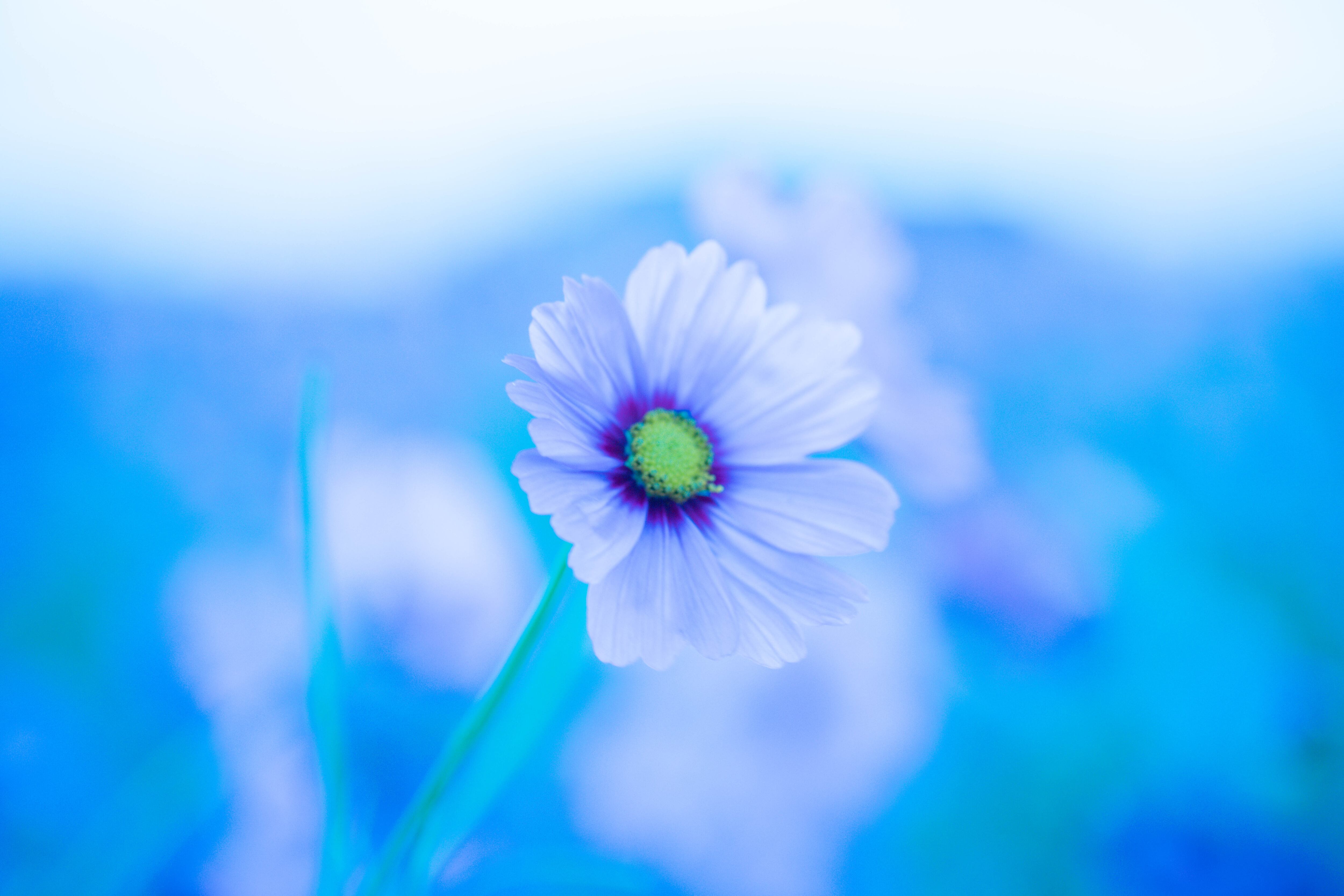 青空の透明感を強調し、ピンク色のコスモスを対比で際立たせる爽やかなトーン。