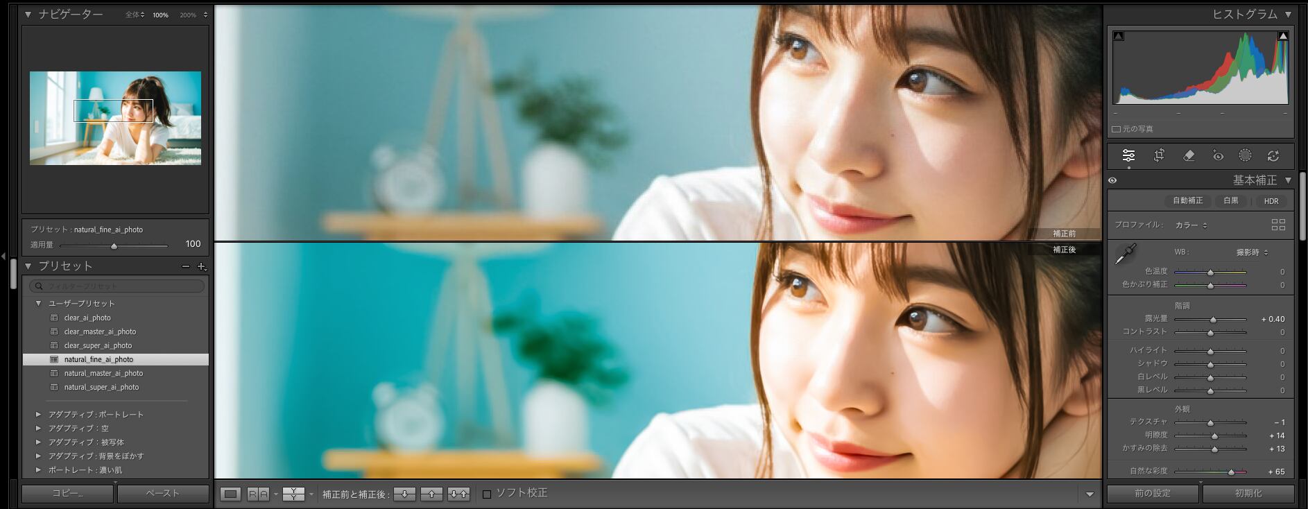 このLightroom用プリセットは、AIで生成した画像をもっと「写真らしく」自然に、美しく仕上げるための専用ツールです。